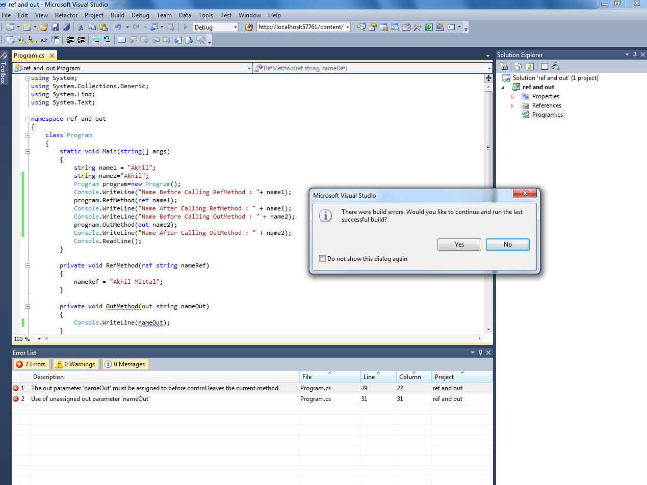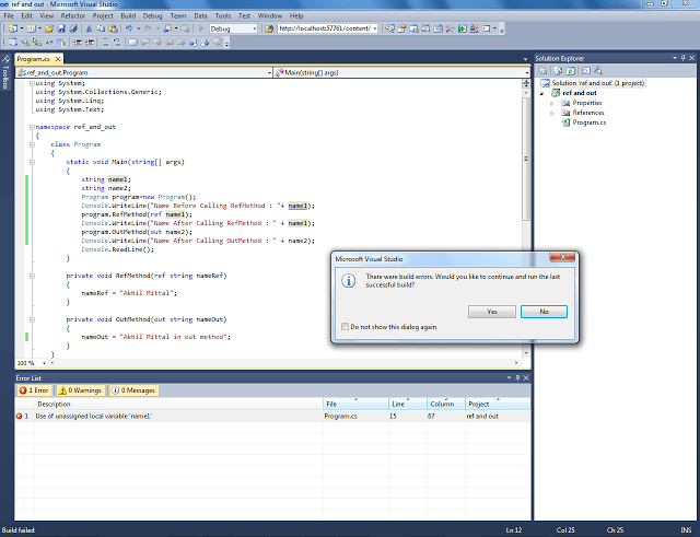 As we can see in the above easy to understand code, I have created two methods RefMethod and OutMethod to handle passed parameter into their invocation.Just to check what were the values of my variables before and after assignment ,When i compiled the code i got the following compile time error,
