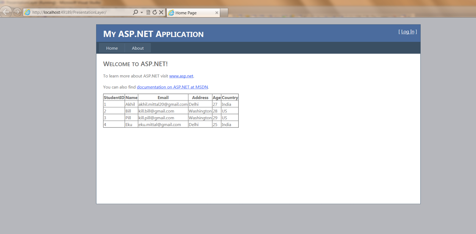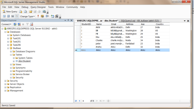 Step 3 : Create a database with a sample table and put some default values in it, for example i have created a database named “EkuBase” and created a siple Student table with following fields, StudentId,Name,Email,Address,Age,Country.The Create script of the table is as follows,