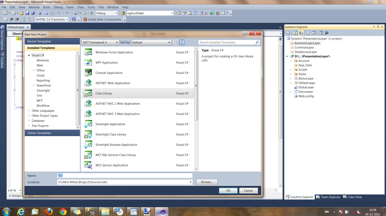 Like wise add two more projects to Common Layer and DataAccessLayer folder respectively and call them Common.csproj and DAL.csproj projects.