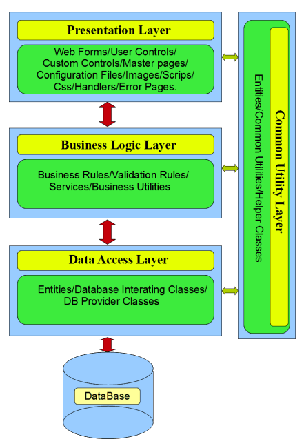 The Data Access Layer Project Contains the entities classes and objects to communicate with database, where as our common project contains properties, helper classes to communicate with all the three layers commonly.It contains the objects to be passed to and fro from presentation layer to data access layer commonly, and also acts as a mode of message passing between the layers.