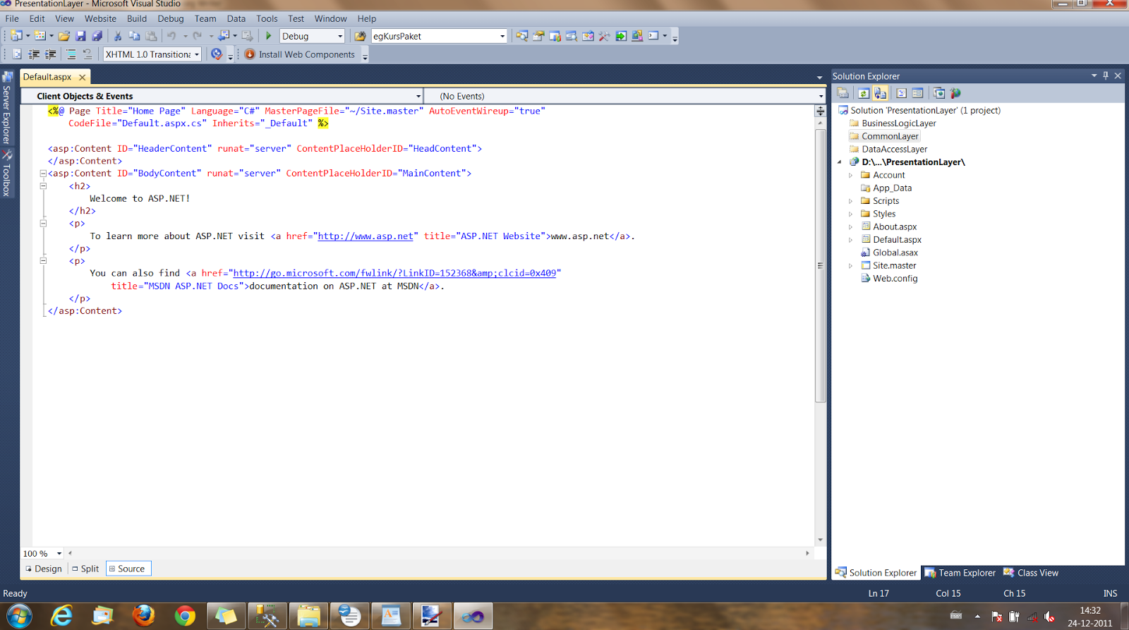 We will make use of class libraries to physically seperate our layers.There for one Web Application/Project, one Business logic layer class library , one Data access layer class library and one Common layer class library can be included in the solution.