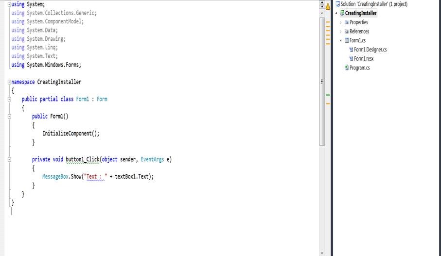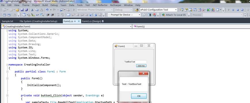 Write few lines of code just to read the txt file from Startup path, in my case bin\debug, it could also be bin\release as per project build, and specify the file folder name and file name to read the content.I chose to keep my txt file at startup path so that I could explain how we can create files and folders at the time of installation. Now we also need this Input folder and a Sample.txt file at the time of installation to be located at the location of installed application.