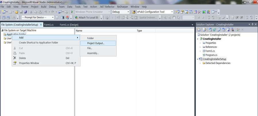 Right click on Application Folder and add an output project , out project specifies for the project we are creating an installer to, like in following figure,