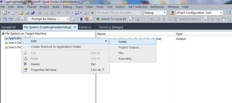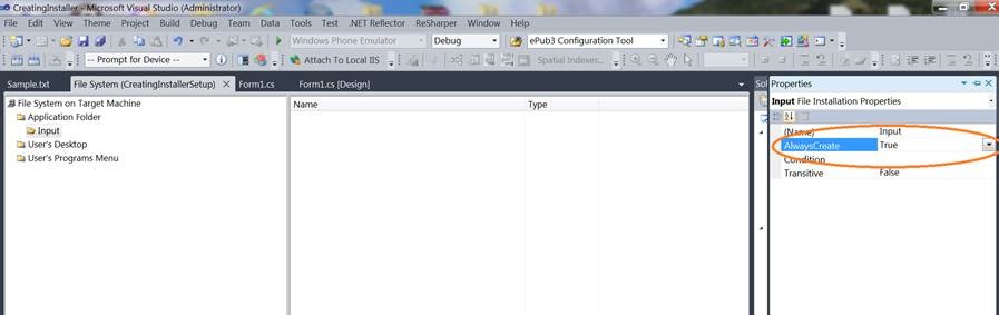 Now this folder creation logic has to be implemented in out setup project, so that when the application installs, it has all the pre-requisites required to run the application, like the Input folder and the Sample.txt file.