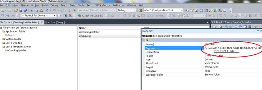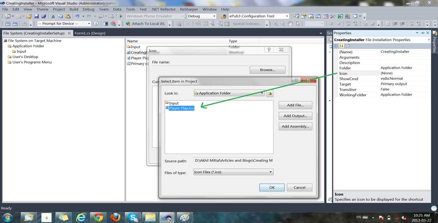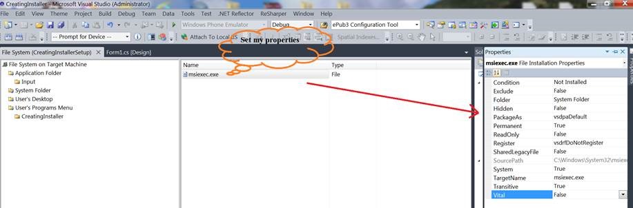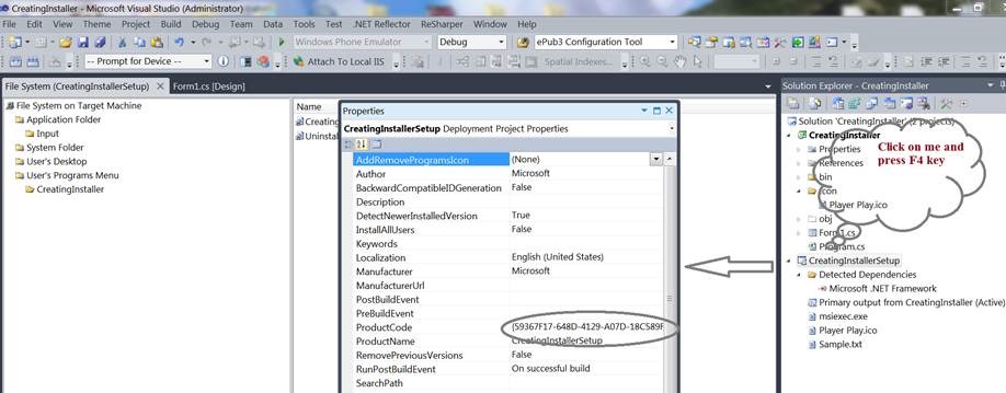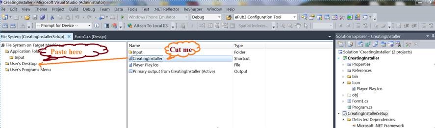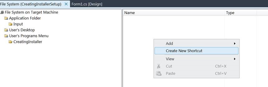 To create a shortcut to the application, right click on Primary output in the middle window pane and select Create shortcut to Primary output, the name that shortcut as CreatingInstaller.