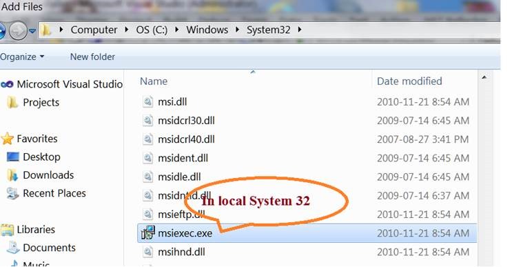 Right click on newly created system folder and browse for the msiexec.exe file in local System.Windows32 folder. This file takes responsibility to install and uninstall the application based on certain parameters specified.