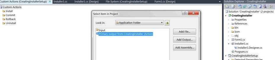 Select CreatingInstaller i.e. the windows application project name in Add output project window, select it as a primary output as shown below and click ok.