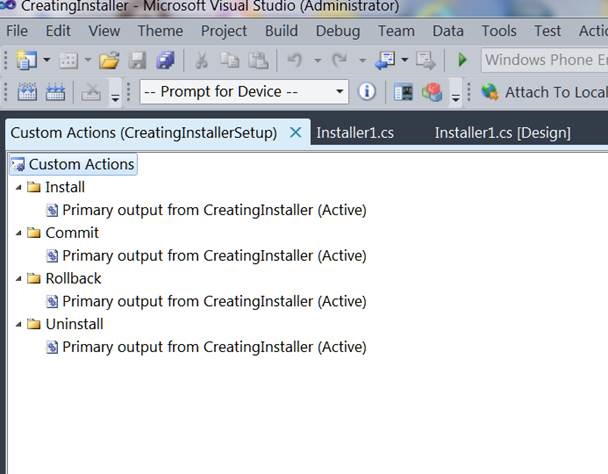 1. Just add an installer class to the windows application we created earlier. When we open the installer class we can see the events specified for each custom action i.e. for Installation, Uninstallation, Rollback,Commit.