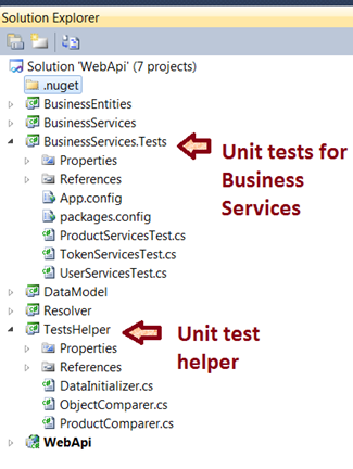 The solution contains the WebAPI application and related projects. There are two newly added projects named BusinessServices.Tests and TestHelper. We’ll use TestHelper project and its classes for writing WebAPI unit tests in the same way we used it for writing business services unit tests.