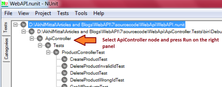5. At the right hand side panel of the interface, you’ll see a Run button that runs all the tests of Api controller. Just select the node ApiController in the tests tree on left side and press Run button on the right side.