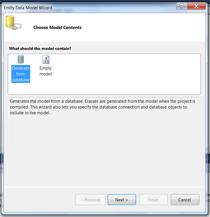 You’ll be prompted with options to generate a model. Choose Generate From Database option and proceed.