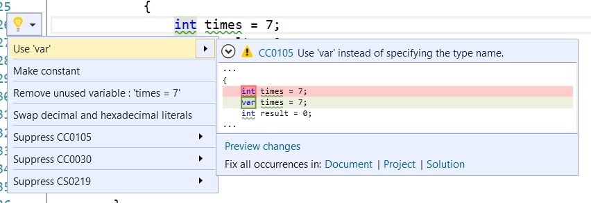 Note that the Error List window here is configured for Current Document. You can change that to Current Project or all open documents as per your requirement. It shows 1 error, 4 warnings and 1 message. The error is displayed by compiler but the warnings and message is displayed through analyzer that we have used in this project. The warnings are self- explanatory. if you don’t know how to fix them, the light bulb icon helps you to fix those. For CC0105 i.e. use var instead of specifying a type name, if you click on int times=7; the light bulb icon will be shown with few suggestions as shown below.
