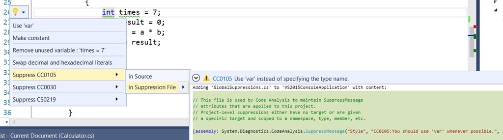 7: [assembly: System.Diagnostics.CodeAnalysis.SuppressMessage("Style", "CC0105:You should use 'var' whenever possible.", Justification = "<Pending>", Scope = "member", Target = "~M:VS2015ConsoleApplication.Calculator.Multiply(System.Int32,System.Int32)~System.Int32")]