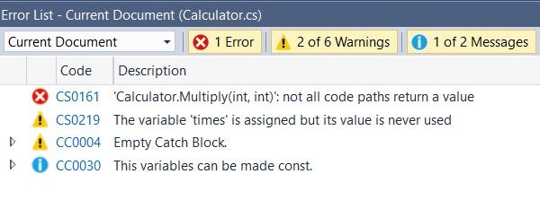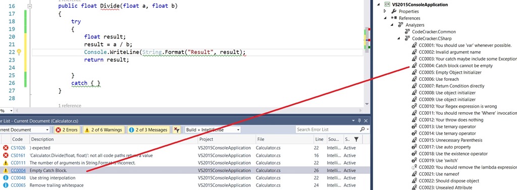 We see that two warnings are shown that means while writing the code we broke two rules of installed code analyzer. The first one says it is warning with code CC0111 with a description that number of arguments for “String.Format” method is incorrect. I purposely wrote the code in this way to explain how code analyzers work. As we can see and compare that the rule shown to us in Error List window matches exactly to that of shown in Code Analyzer’s set of rules list at right side. This proves the code analyzer is working as desired. Here we see that we need not have to compile the application and as soon as we fix the code, the error/warning of code analyzer is gone. I purposely left catch block empty so that the code analyzer may validate the code against its defined rule for catch block and suggest us. It clearly says CC0004 Empty catch Block rule is violated.