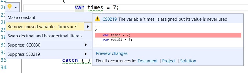 There are other suggestions like Suppress CC0105, CC0030, CS 0219. Light bulb icon provides you an option for what to do with similar kind of warnings and errors in future. In case you do not want a suggestion to be shown for a particular analyzer warning or message, then you can opt to suppress that message which means it will not be shown again.