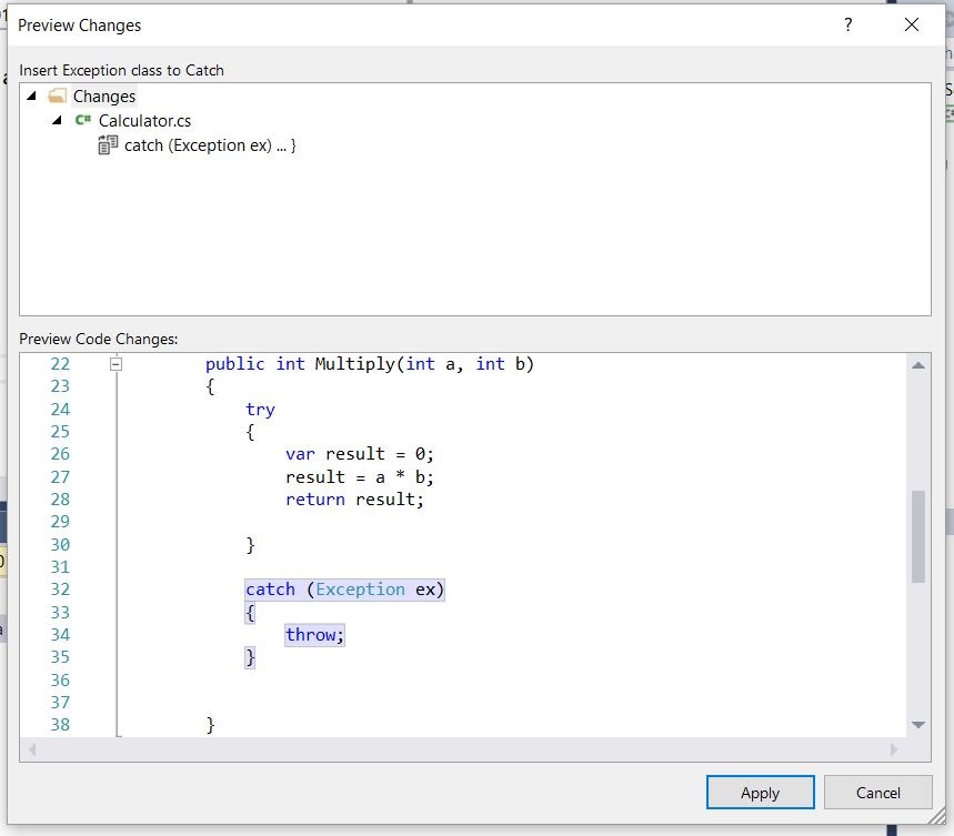 We have already seen how to suppress a message and warning, so let us try the third option i.e. Insert Exception class to catch. Note that you don’t have to explicitly write catch block unless you have some custom requirement in the case. Just choose the third option and preview changes.