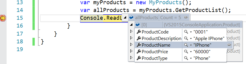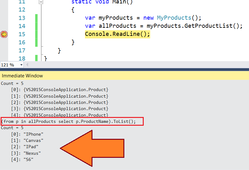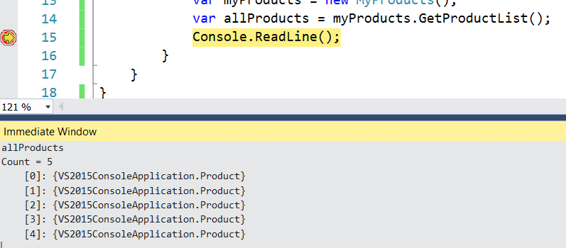 This is one of the best improvements that Visual Studio 2015 has come up with. In earlier versions of Visual Studio when a developer tries to execute/write LINQ or Lambda expressions in immediate window or watch window, the code was not supported and a message used to appear that LINQ and lambda expressions are not allowed in immediate or watch window. With the newly released product i.e. Visual Studio 2015, this limitation has been taken care of. Now a developer can take liberty to execute LINQ and Lambda expressions in immediate window. This feature proves to be very helpful in run time debugging the code, one can write LINQ queries in immediate windows at run time to select or filter the lists or objects. Let’s cover the topic through practical examples. We have already a solution with a console application that fetches a list of Products. To practically check this tool support feature, place a breakpoint at Console.ReadLine() in program.cs i.e. when the list is fetched.