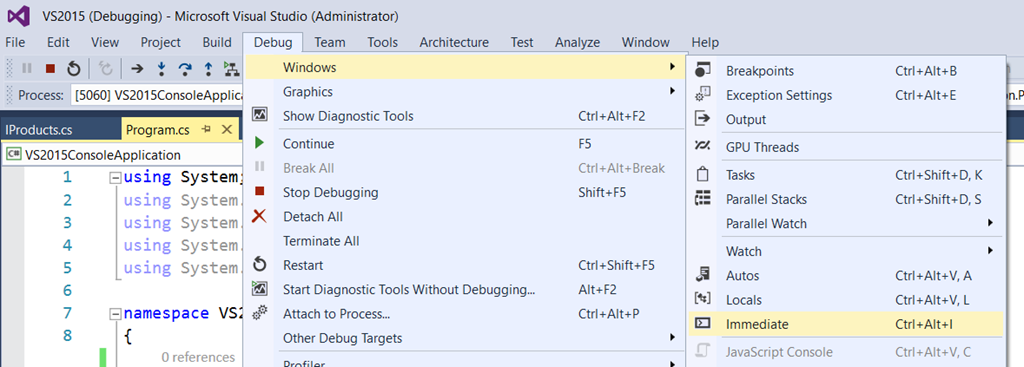 Open the immediate window. You can open it through Visual Studio Debug menu as shown below. I.e. Debug->Windows->Immediate or you can use the keyboard default shortcut to open the window i.e. Ctrl+Alt+I.