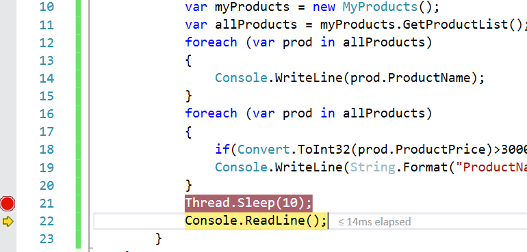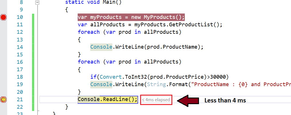It clearly says the time elapsed till the previous step was less than or equal to 14 milliseconds. You can also get the time elapsed between two breakpoints. Let’s try to do that. Let’s put the first breakpoint at the start of the method and another at last line of the method. Now when you run the application the code execution stops at the first breakpoint. Simply press F5 or continue with the execution, the execution will halt at the second breakpoint, therefore showing the total time elapsed for the complete method to execute.