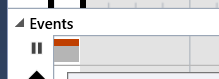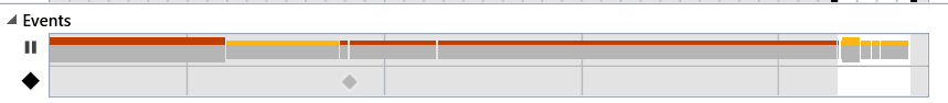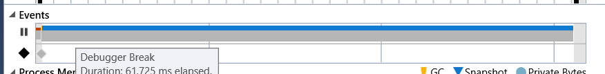 The Debugger Events view in the Diagnostic Tools window displays events that occurred during the debugging session. This view is broken into tracks. The Break Events track shows events which stopped execution of the application, such as breakpoints that were hit, stepping through the code or breaking exceptions. The bars indicate the amount of time the application was running in between break events. The bars in this track are color coded, red indicates a breakpoint or breaking exception, yellow indicates a step through the code, and blue indicates a break all operation.