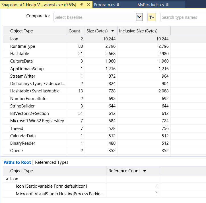 The Process Memory section of the Diagnostic Tools window helps you monitor the memory usage of the app while you are debugging. A memory usage tool was introduced in Visual Studio 2013 as part of the Performance and Diagnostics hub. In Visual Studio 2015, this tool was merged into the Diagnostic Tools window and enhanced. As with the current memory usage tool, you can take a memory snapshot at any point in time and compare it against another snapshot.
