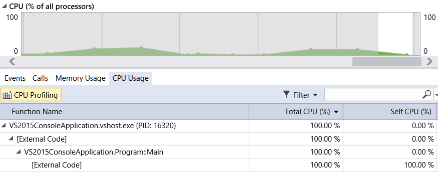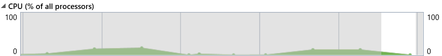 The CPU utilization section of the Diagnostic Tools window helps you monitor the CPU usage of your application by viewing a live CPU graph.