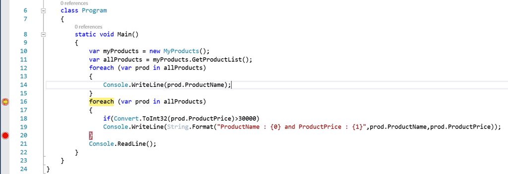 This article will cover the different views of Diagnostic Tool Window, one by one. We’ll use the existing code base as a sample to explore the features. Place the breakpoints at two locations as shown below in the existing Program.cs file we have been using throughout the prior articles.