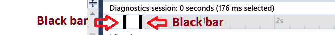 This example debugging session was 0.19 seconds in length from the time of application start until the current breakpoint, and we are looking at about 5.5 seconds of that time here in the timeline. The black bars here and here allow you to select a portion of the timeline.