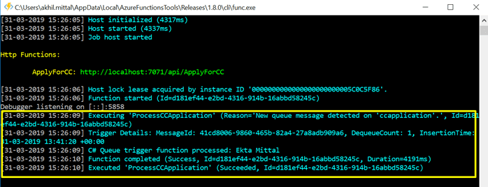 Remember, we already had a message in the queue for an applicant named “Ekta Mittal”. As soon as the application is launched, our queue trigger function is active and keeps looking into the queue that we defined in Azure storage for the new messages. Since we already had a message this trigger processes that message, you can see the same in the console as it says “Executing ‘ProcessCCApplication’ ….”. Once processing is done, it says “Executed…”.