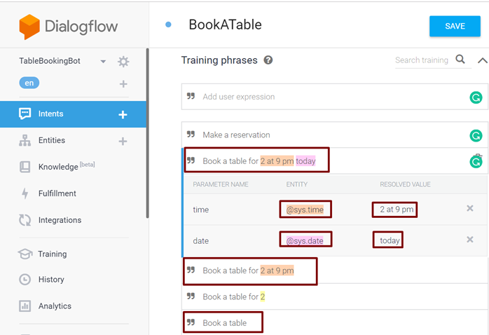 - Now at the Action and parameters section, we see three parameters added based on the training phrases i.e of type, number, date and time. A bot expects the user to provide these parameters when user types in. Click on “SAVE” to save the training phrases and parameters till time.