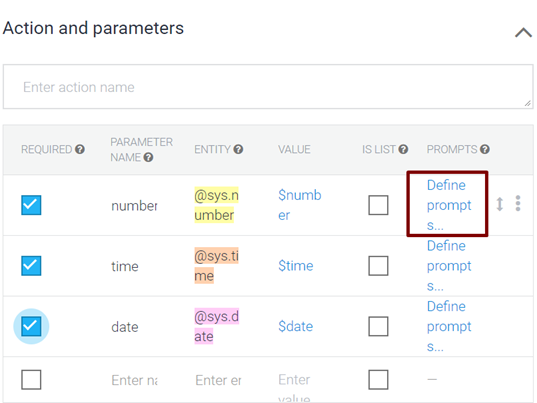 - We can also make these parameters mandatory for the user to provide and set the default prompts for the parameter. So that if the user does not provide those parameters, the bot asks the user to provide that. Click on “Define prompt.” link for the number.