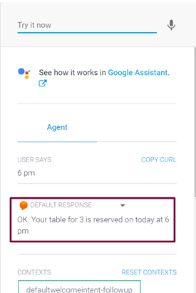 - We can provide the default response of this intent that says, “You table is booked” and also provide the input parameters in the default response like “your table I booked for the $number on a $date at a $time” where the $ and corresponding parameter is the input parameter that user provided. You can play with lots of given action and parameters likewise to make your bot more interactive and cooler. This default response is the response that a bot returns if there is no webhook or functionality that takes care of user’s input texts. Save the intent.