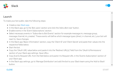 - Go to the Integrations section of Google Dialogflow console and enable Slack.
