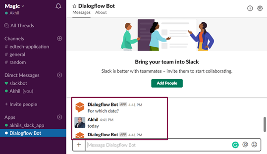 - Open the newly created Slack app and type “Hi”. It will respond as expected.