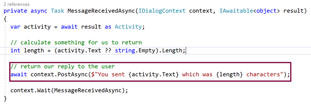 await context.PostAsync($”You sent {activity.Text} which was {length} characters”);