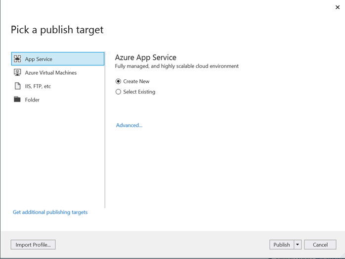 Choose App Services and you can choose to create new app service here and click on Publish, it will land up on a new page to fill up some user information.