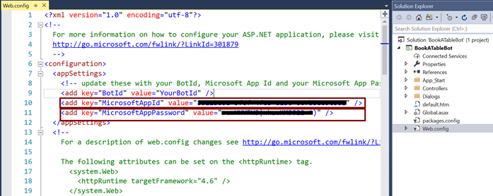Go back to Visual Studio, and in the Web.config, provide the MicrosoftAppId and McrosoftAppPassword that we got generated.