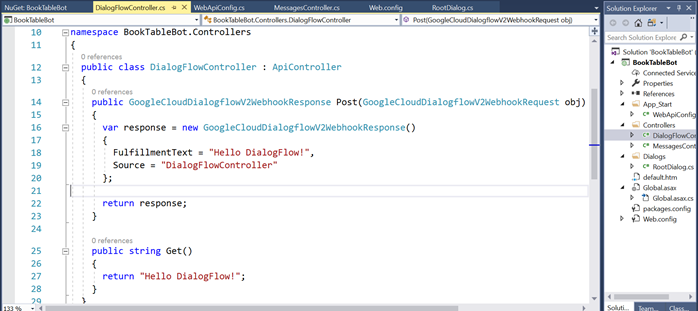 Add a new controller to Controllers folder and name it DialogFlowController. Add a Post method that takes GoogleCloudDialogflowV2WebhookRequest as a parameter and returns back
