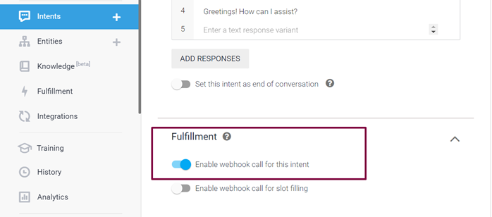 Go back to the Dialogflow console. Make sure you got the webhook enabled for fulfillment and the bot API URL inplaced in the webhook. This was explained earlier in this tutorial. Make sure the fulfillment option is enabled for BookATable and Welcome Intent.