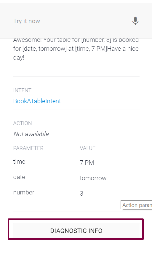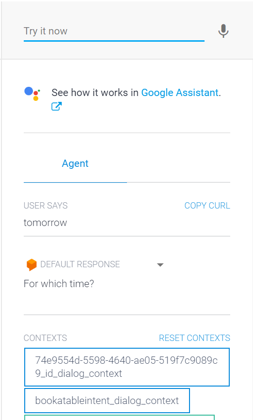 - Now follow the instruction of Welcome intent response and type “Book a table”. The default response will ask for the date, time and number of persons.