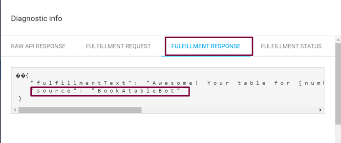 We get to see all the requests and response for our intent. Check Fulfillment Response and the Source inside it. It comes from our webhook.