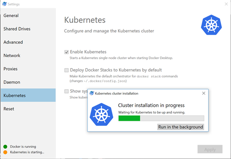 Time to get hands-on with Docker, Containers, Kubernetes and AKS. We’ll create an ASP.NET Core application and first containerize it with Docker and the deploy to AKS cluster. The logic of the application doesn’t matter here as we’ll just use application for the sake of having an application to deploy. The focus would be on Dockers, Containers, Kubernetes and AKS cluster. When the application is dockerized, we’ll create a local image of the application to test locally. Then we’ll deploy the application on local Kubernetes cluster and then later we’ll push the same application to AKS. Once docker for windows is installed and running, go to the settings and enable the checkbox for Kubernetes as shown below.