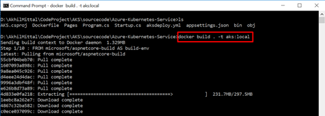 Make sure that we are in the directory that contains a Docker file and then run the docker build command followed by a dot to indicate that the Docker file is located in the current directory and use the -t switch to specify a tag of aks:local.