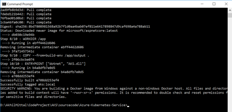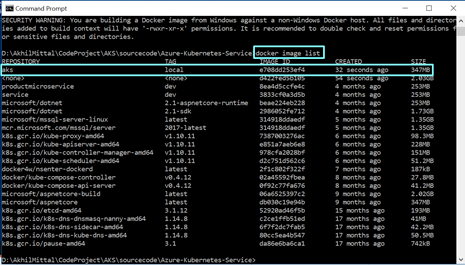 Once the build completes, run the docker image list command, it lists a brand-new image called aks:local.