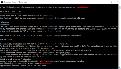 Execute dotnet run as shown below. This will run the server and tell on what port the server is listening for the application i.e. http://localhost:5000.