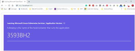 Navigate through the provided URL i.e. http://localhost:5000. It is a simple application with just showing the host or container in which the application is running. Currently, it runs on a development windows machine without a container and so it shows the name of the host machine i.e. 3593BH2.