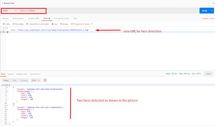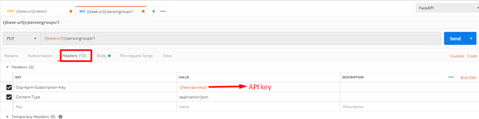 I have used some settings in the Postman to save my base URL i.e. https://centralindia.api.cognitive.microsoft.com/face/v1.0 and the secret key. So I’ll use the keyword {{base-url}} and {{face-api-key}} for URL and key respectively. You can use the base URL and the key you have in place of my keywords.