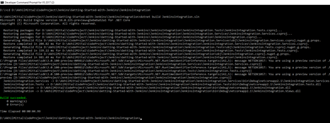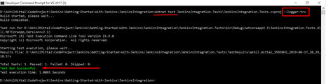 If you open the solution file in Visual Studio, you’ll see that there is a test project named “JenkinsIntegration.Tests.csproj” that contains a single test. We’ll run this test vis dotnet command locally and log the results in a log file. So, run the rest via the “dotnet test <test project name> –logger:trx” command as shown below. Once the tests are passed, it will say “Test Run Successful”.