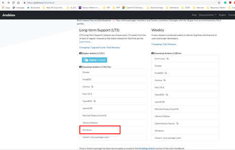 Click on the Download button and it will show the list of options for downloadable. We’ll use the Windows version of Jenkins downloadable. So, click on Windows in the LTS list and the download should begin immediately.