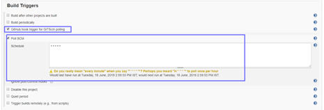 - In the “Build Triggers” we’ll again use “* * * * *” which is explained in the last section.